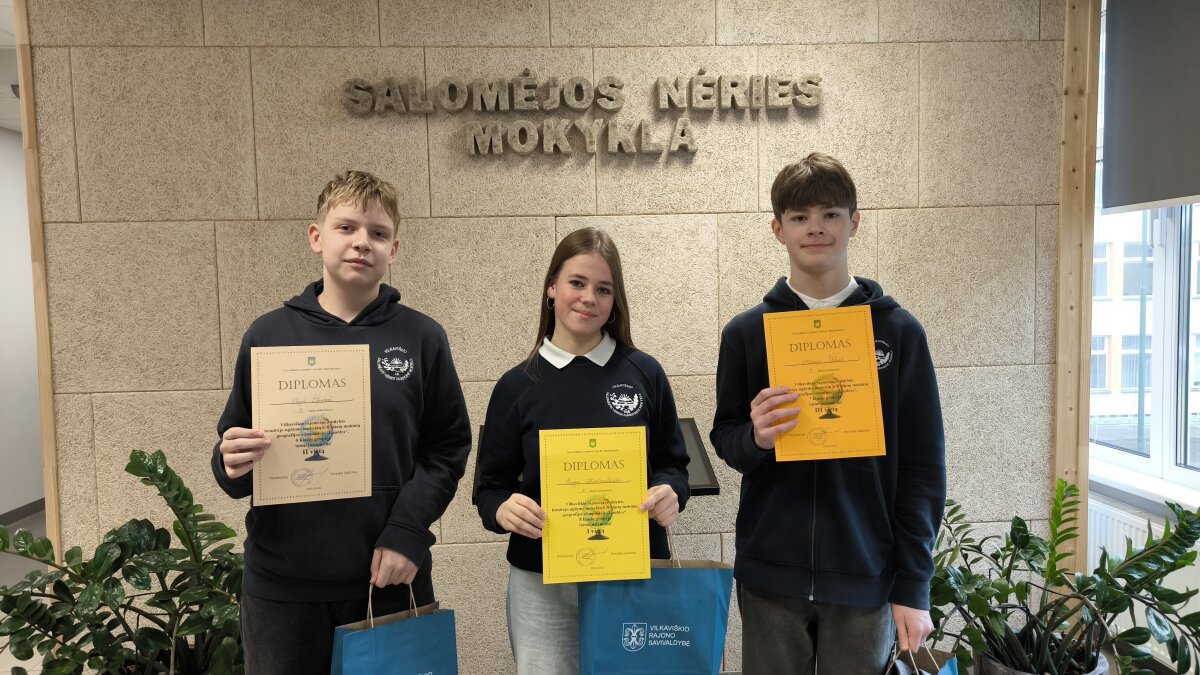 Mokiniai dar kartą įrodė puikiai pažįstantys pasaulį nuo gimtosios Lietuvos iki tolimiausių žemynų. Džiaugiamės ir didžiuojamės puikiais jų pasiekimais: 8 klasių grupėje I vietą užėmė Elinga Klimčiauskaitė, 8a klasės mokinė, 6 klasių grupėje II vieta atiteko Tajui Žibūdai, 6c klasės mokiniui, 7 klasių grupėje III vieta laimėjo Motiejus Šlekys, 7c klasės mokinys.