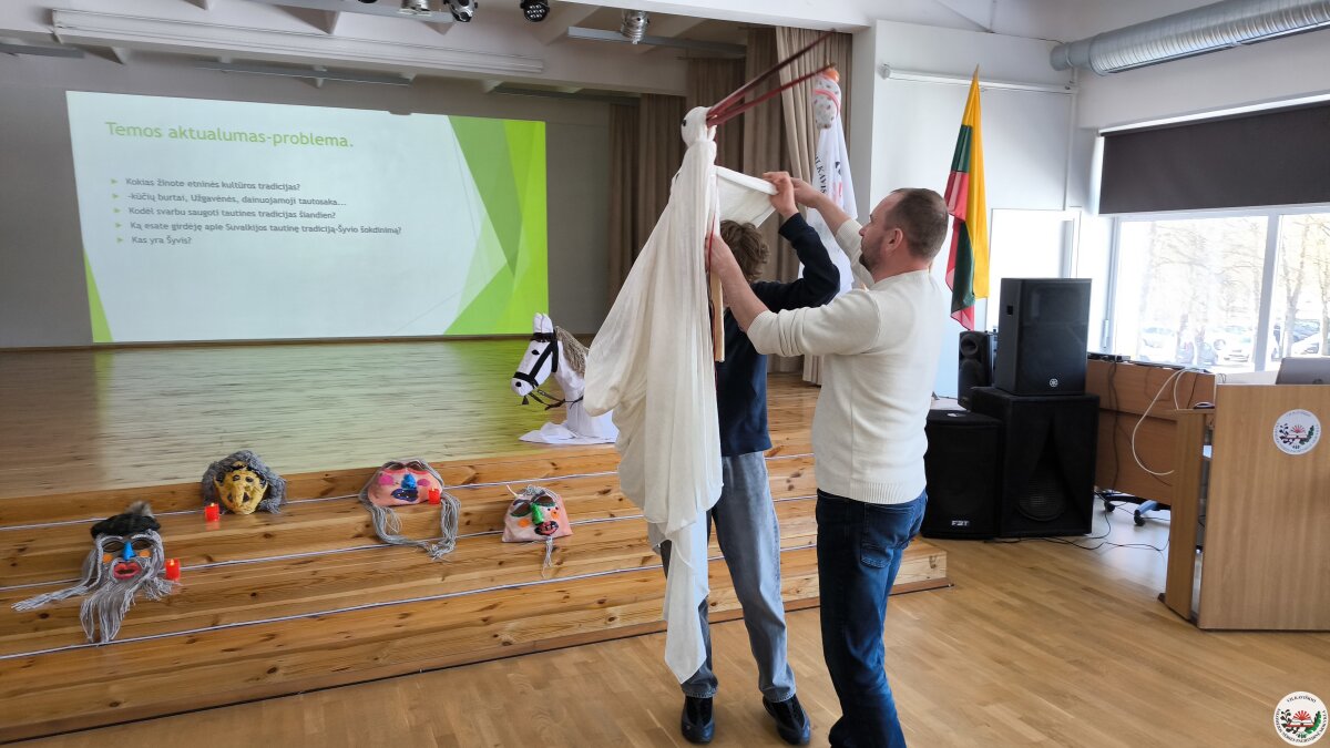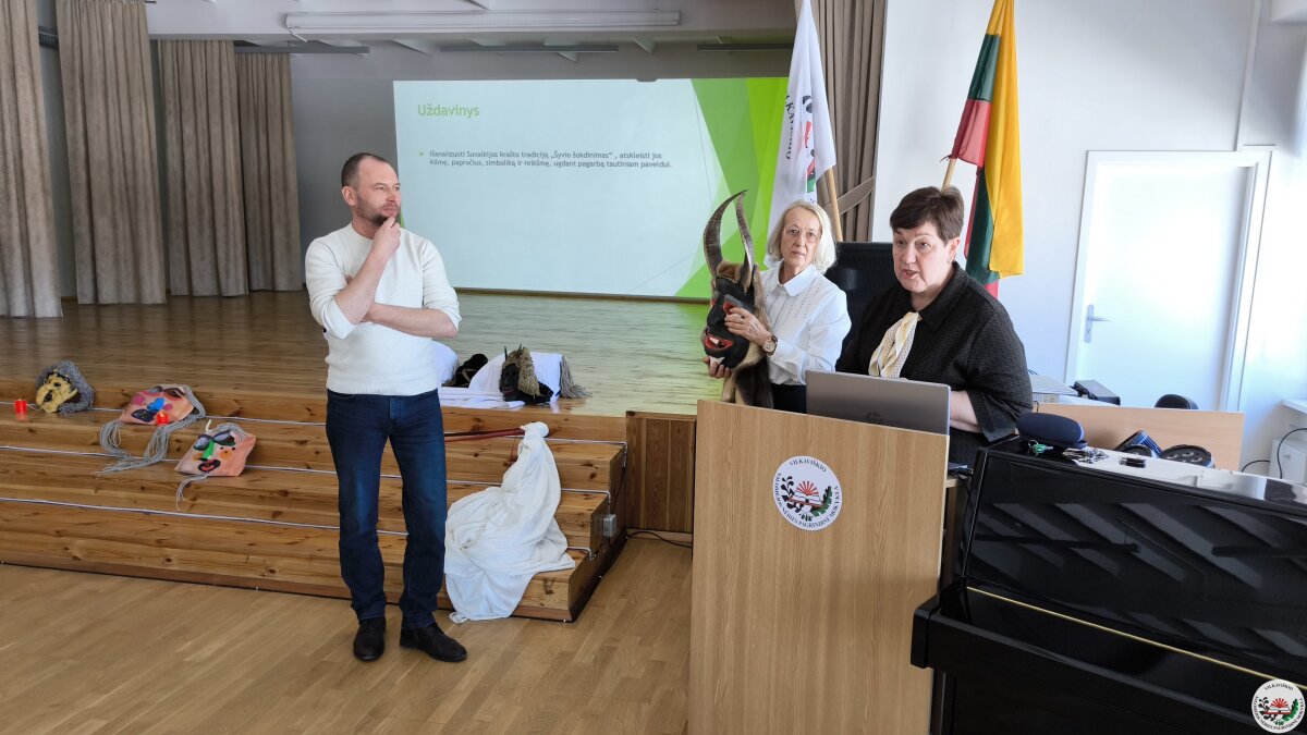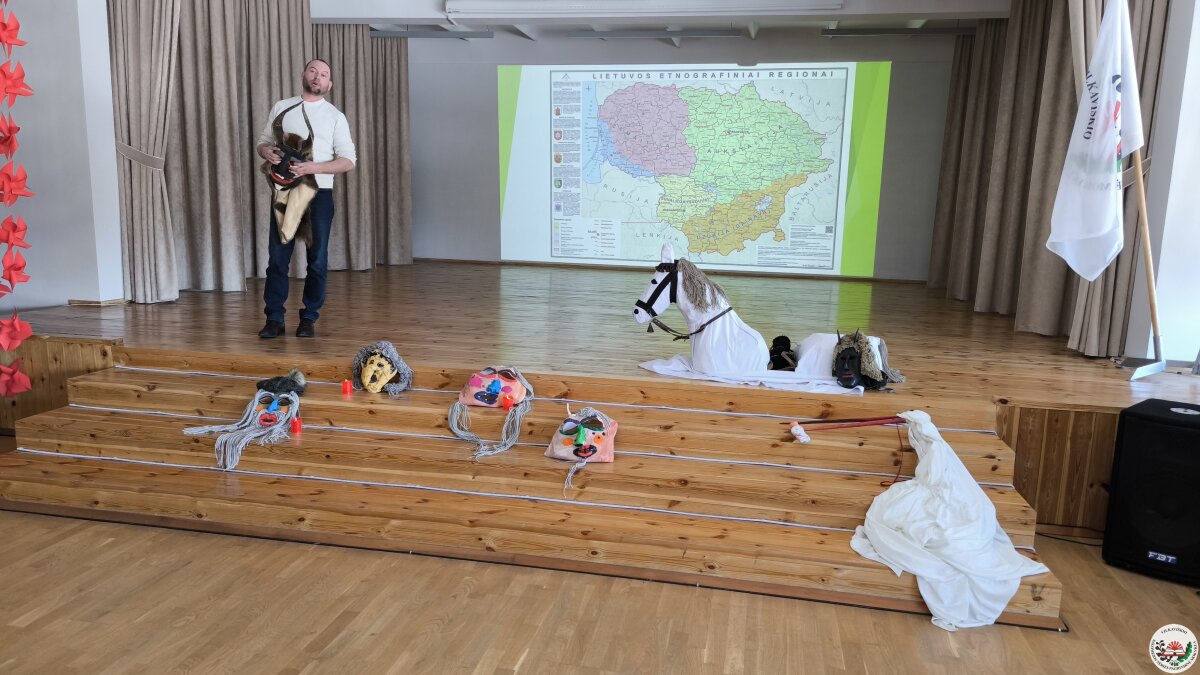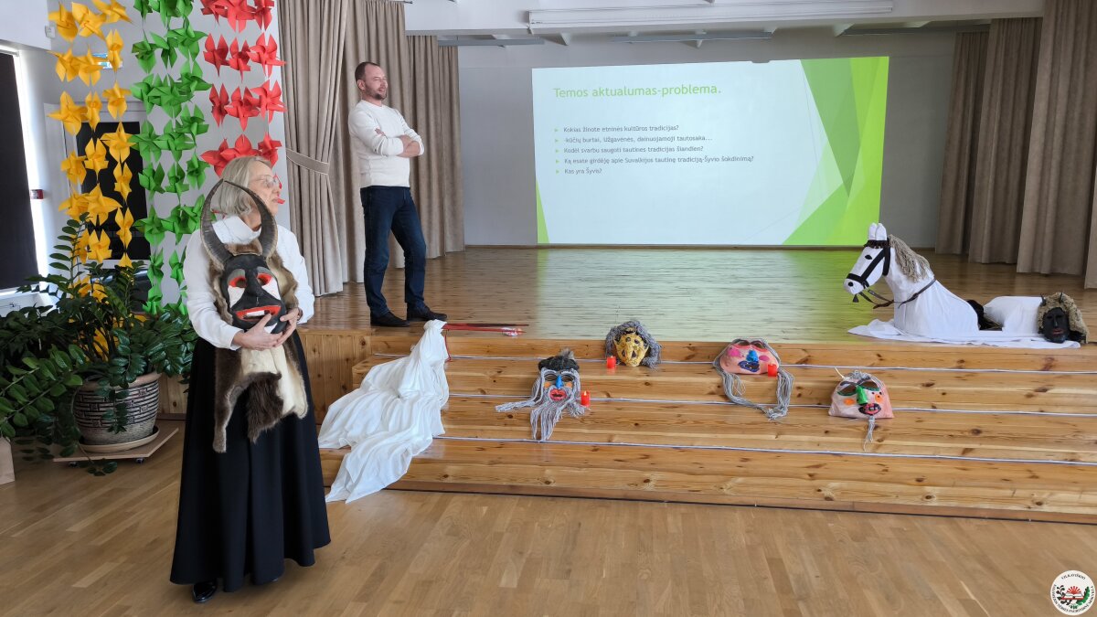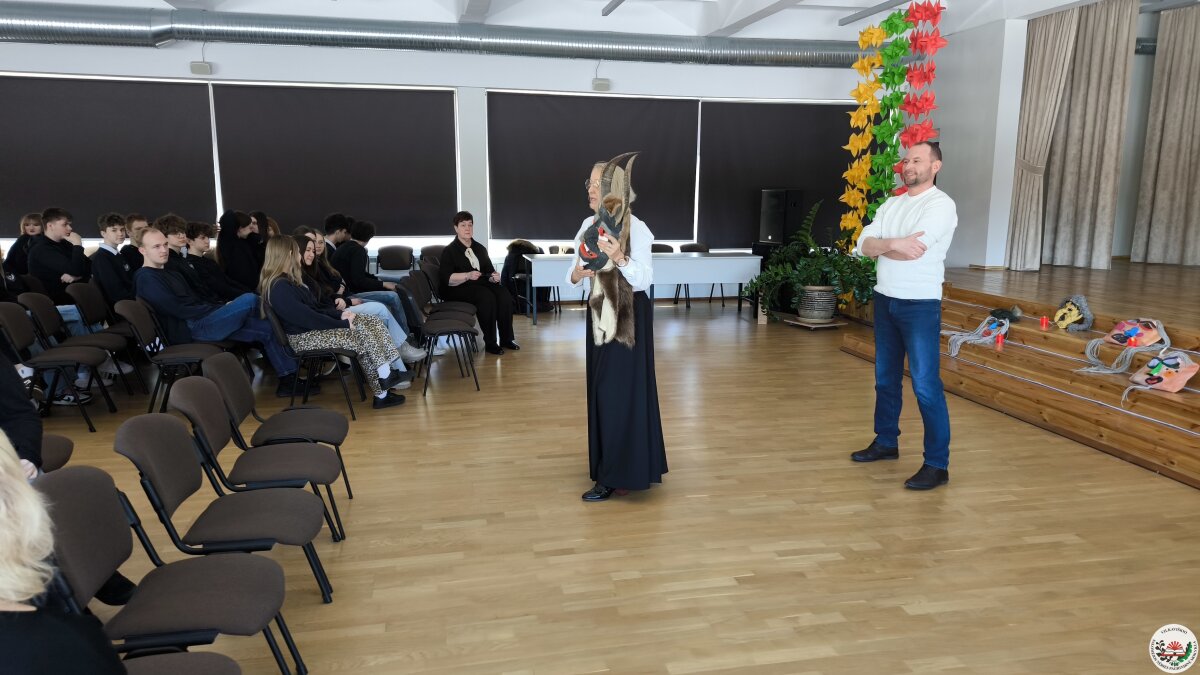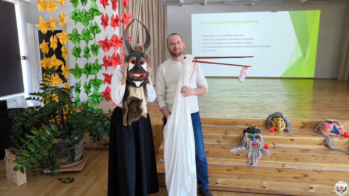 Kodėl šiandien svarbu saugoti tautines tradicijas? Į šį klausimą mokiniams atsakė svečias iš Suvalkijos (Sūduvos) kultūros centro–muziejaus – etninės kultūros specialistas, etnologas Andrius Milinkevičius. Jis pristatė savo sukurtas Užgavėnių karnavalo kaukes ir priminė, kad tai labai sena tradicija, kviečianti simboliškai bendrauti su protėviais ir pažyminti žiemos virsmą pavasariu. Pasak etnologo, kaukės turi išvyti ir išgąsdinti visas žiemos negandas bei ligas.