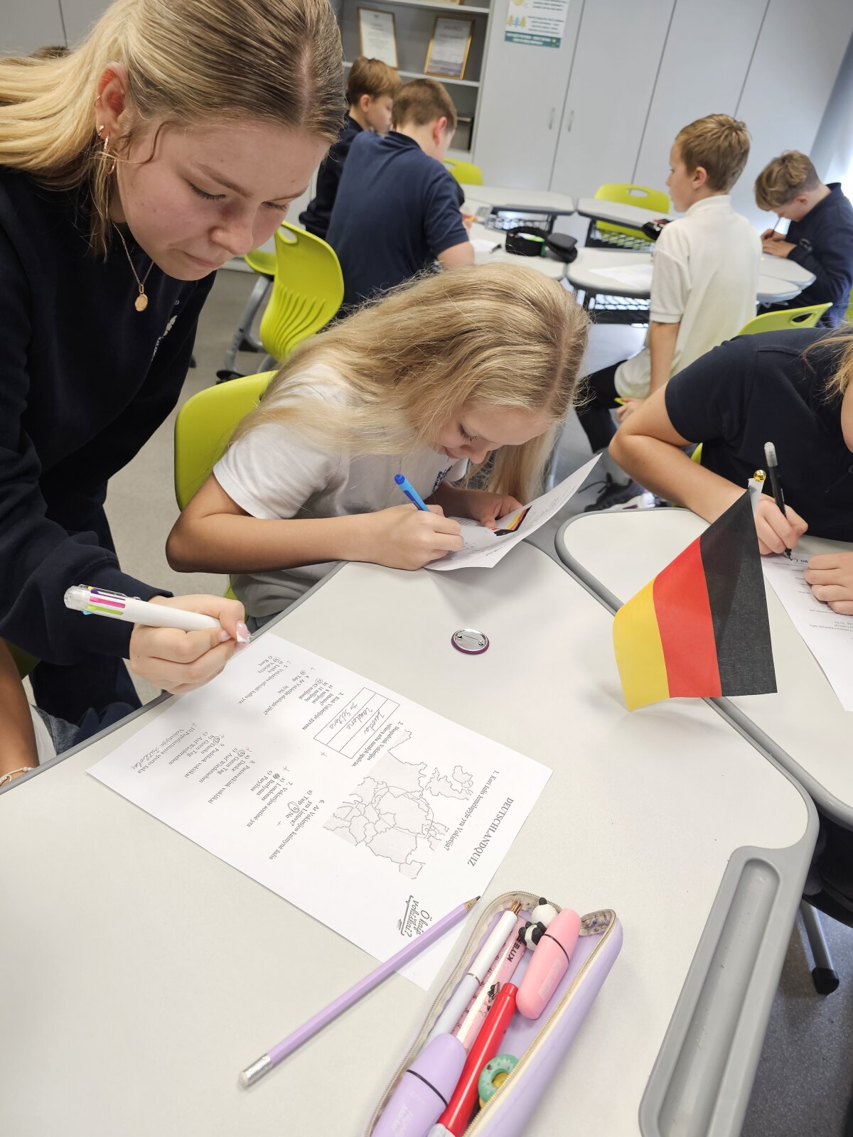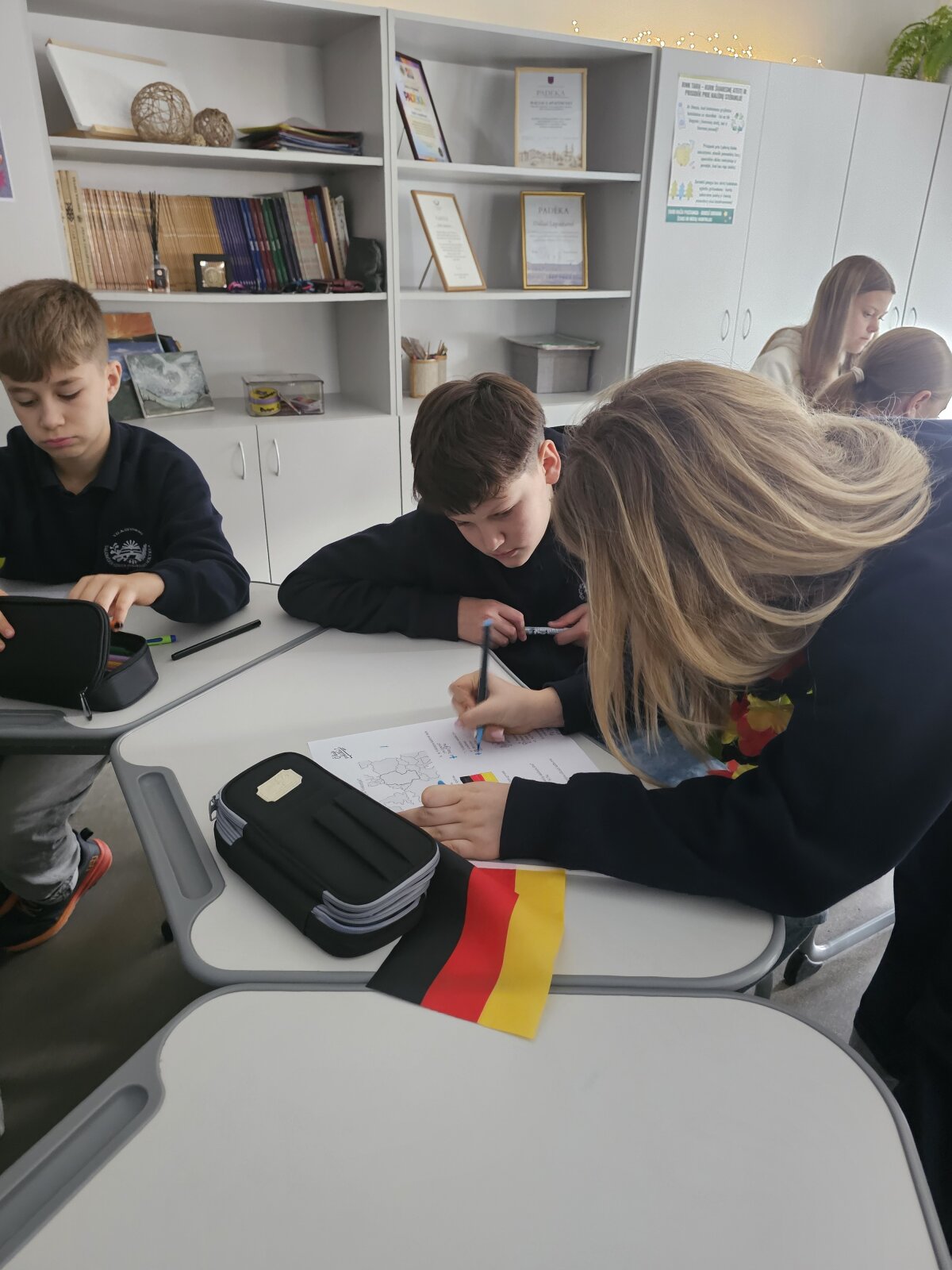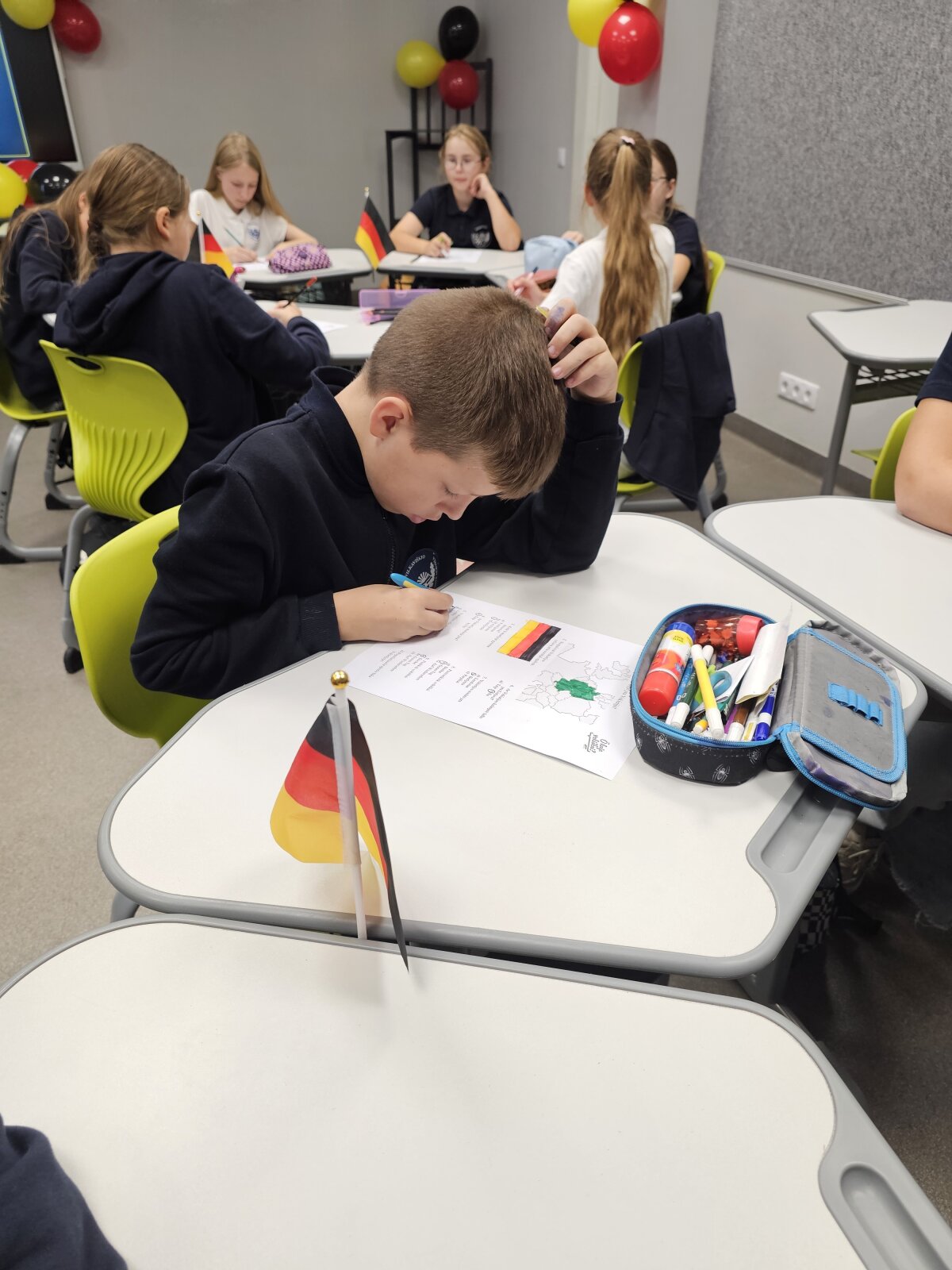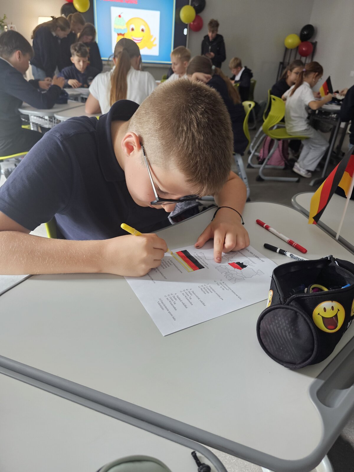 Penktos klasės mokiniai buvo pakviesti į netradicinę vokiečių kalbos pamoką, kurios metu dalyvavo viktorinoje, atliko įvairias užduotis ir susipažino su vokiečių kalba. Penktokai išmoko vokiškai pasisveikinti, atsisveikinti ir mandagumo žodžių, kurie pravers, kai jie keliaus į vokiškai kalbančias šalis.