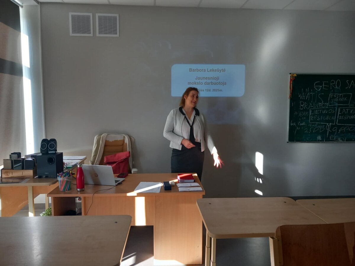 Buvusi mūsų mokyklos mokinė B. Lekešytė, jaunesnioji mokslo darbuotoja, dirbanti Valstybiniame mokslinių tyrimų institute Inovatyvios medicinos centre, Imunologijos ir bioelektrochemijos skyriuje, ne tik studijavo ir stažavosi Anglijoje, Švedijoje, Airijoje, Italijoje, Čekijoje ir Lenkijoje, bet ir buvo kviečiama dirbti šiose ir kitose šalyse. Su šia mokslininke susitikti buvo pakviesti 8 klasių mokiniai. Jauna moteris dalinosi su mokiniais savo patyrimai ir ragino į mokslą žvelgti kaip į kelionę, kurioje sutinki naujų žmonių, patiri nuotykių, sužinai kažką nauja.